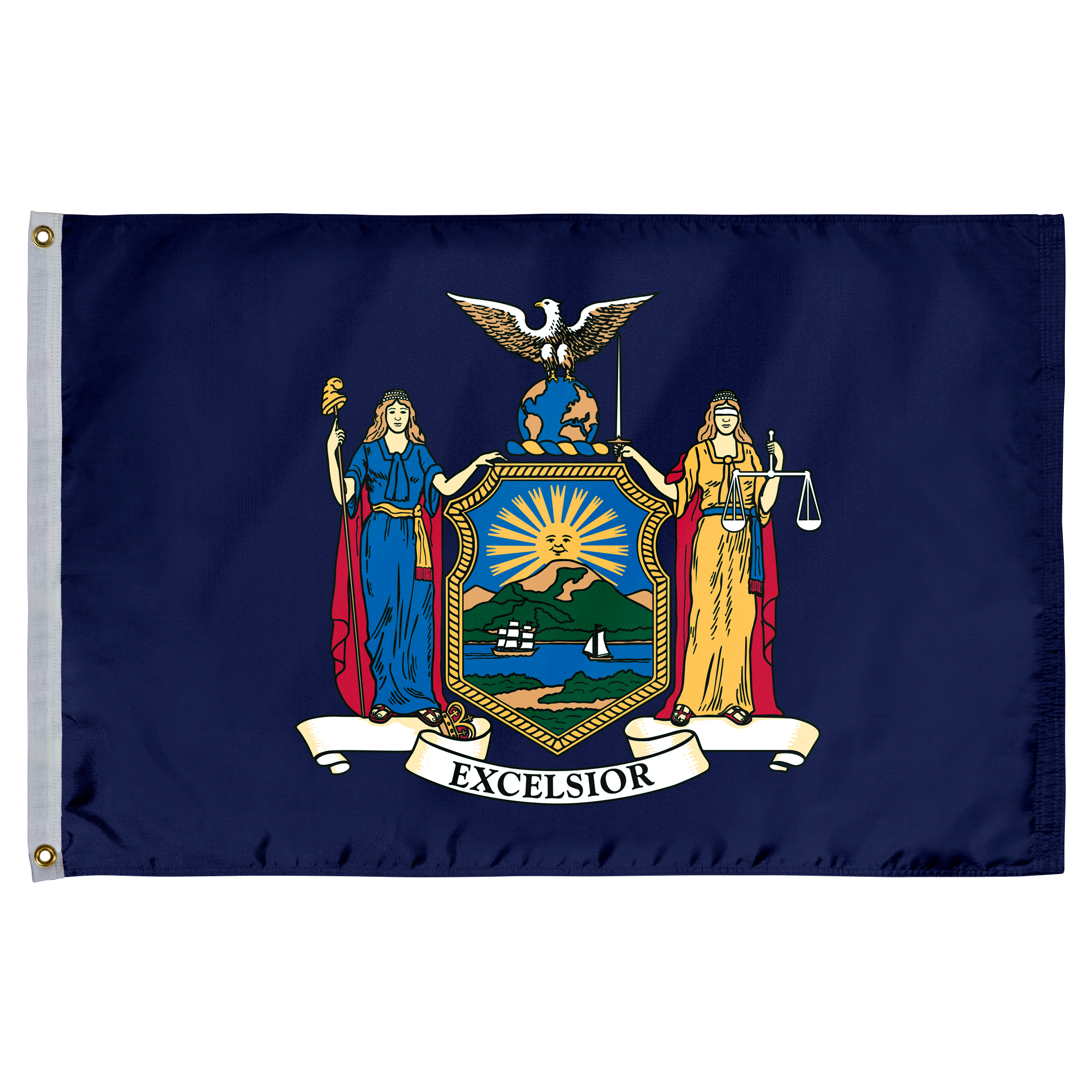 The New York State Flag displays the state coat of arms on a blue field. Adopted in 1901, it represents liberty, justice, and strength.